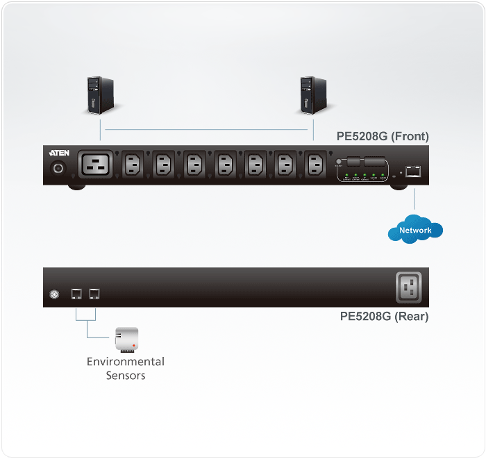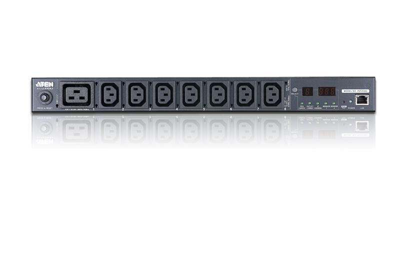 ATEN PE5208G / PE5208G-ATB-G - Устройство распределения питания/PDU, без управления, 16A, 3.68kW, 8 портов/port, 1 банк, IP доступ, ввод C20, (7*C13+1*C19;монитор. V / A / кВт / кВт·ч по устройству;без шнуров)