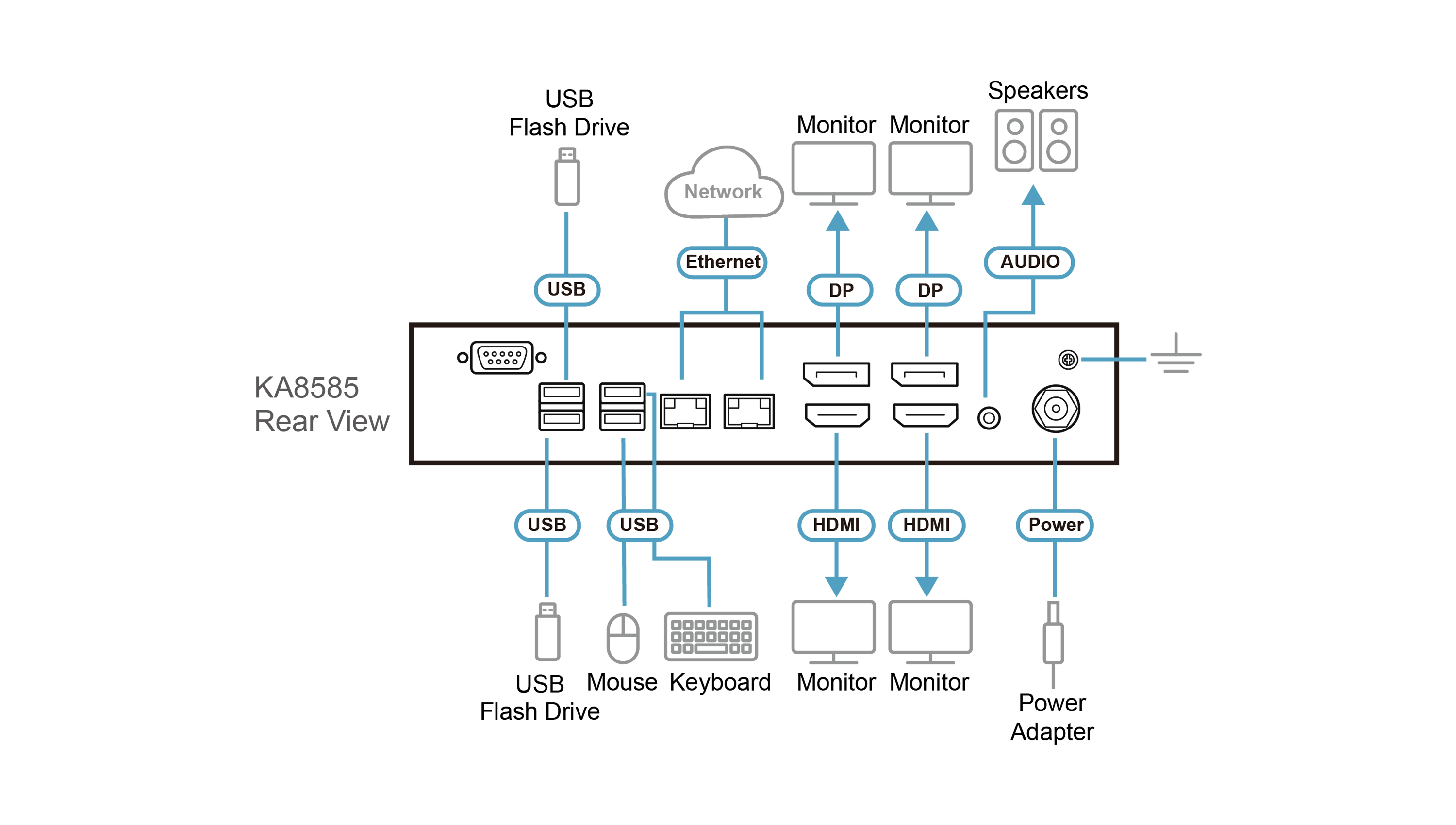 Станция KA8585 совместима с USB-мышами и клавиатурами и оснащена двумя видеовыходами DisplayPort и двумя HDMI, поддерживающими разрешение до 4096 x 2160 при 60 Гц. Это дает пользователям возможность эффективно работать в многозадачном режиме на четырех дисплеях, используя всего одну клавиатуру и мышь. Помимо этого, для каждого экрана доступны как режим управления, так и режим мониторинга массива, что обеспечивает пользователям интуитивно понятные и гибкие инструменты, адаптированные к специфике конкретных задач.