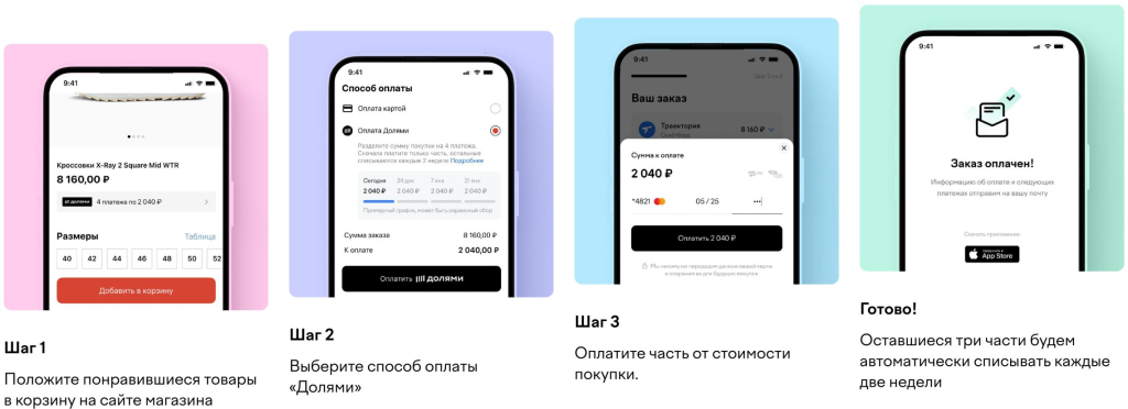 Сервис «Долями» помогает разделить сумму покупки на четыре платежа, а покупку вы получите сразу после оплаты первой части.