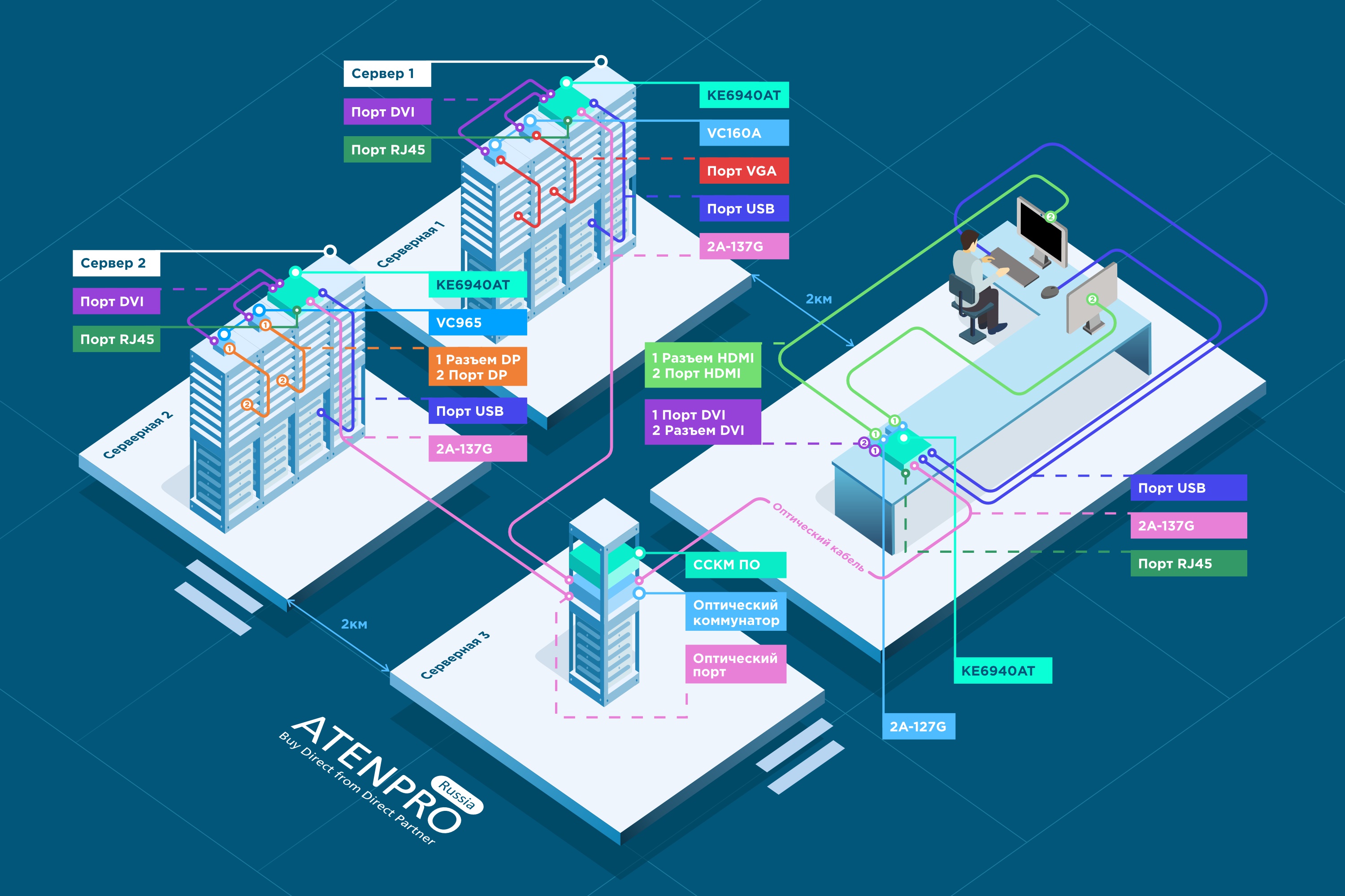 Наиболее рациональным решением стало использование KVM удлинителей по оптоволокну. Эти устройства позволяют передавать сигналы клавиатуры, мыши и видео по одному оптоволоконному кабелю на значительные расстояния. Для реализации данной задачи были выбраны KVM удлинители с поддержкой двух мониторов. Это позволило передавать видеосигнал с обоих видеовыходов серверов 1 или 2 на два монитора удаленного рабочего места без потери качества. Для каждого из двух серверов потребуется установить по одному KVM передатчику ATEN KE6940AT (с доступом по IP и поддержкой двух дисплеев), а на удаленном рабочем месте оператора - один KVM приемник ATEN KE6940AR.Также, в соседней от оператора комнате находится серверная 3, в телекоммуникационном шкафу которой установлен сервер с предустановленным программным обеспечением Matrix Manager для KVM-удлинителей с доступом по IP (CCKM), для организации подключения 2-х передатчиков (от каждого сервера по одному) к одному приемнику KVM удлинителя. Данная схема подключения позволит оператору удаленно по IP управлять и переключаться между двумя передатчиками, и, соответственно - серверами, для оперативного отслеживания всех технических параметров на каждом из них.